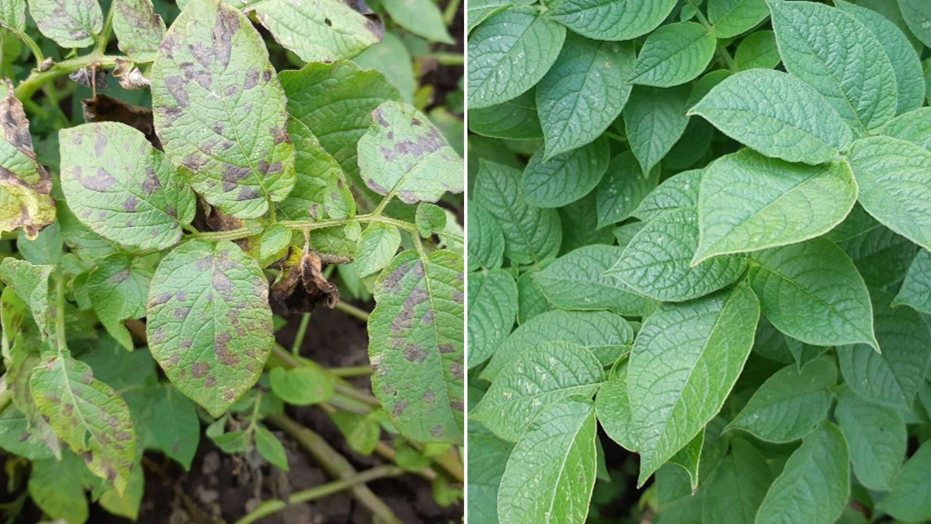 Links Alternaria-Kontrolle, rechts Belanty®, Quelle: Bezirksstelle Bremervörde - Standort Grundoldendorf (LK STD) - Sorte Amado (Fotos vom 25.08.2021)