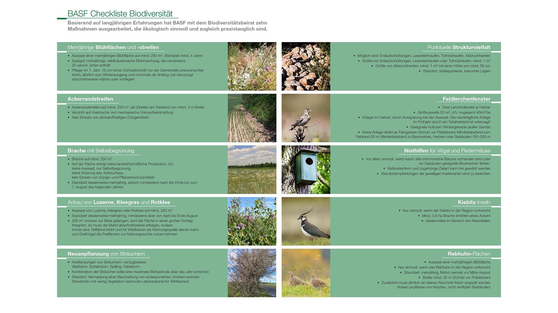 Maßnahmen zur Förderung der Biodiversität müssen vielen Ansprüchen gerecht werden. Oft stehen Praxistauglichkeit und ökologischer Mehrwert hier in einem Interessenkonflikt. Aus diesem Grund hat BASF den Biodiversitätsbeirat ins Leben gerufen. Er besteht neben Landwirten verschiedener Betriebsgrößen und Produktionsrichtungen auch aus Wissenschaftlern des Natur- und Umweltschutzes sowie aus Kommunikationsexperten und Vertretern von NGO‘s. Gemeinsam wurden zehn Biodiversitätsmaßnahmen definiert, die einen positiven Beitrag zur Biodiversität leisten, gleichzeitig aber wenig in Betriebsabläufe eingreifen. Diese zehn Biodiversitätsmaßnahmen werden in der Checkliste Biodiversität mit konkreten Umsetzungsempfehlungen beschrieben.
